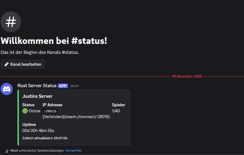 DiscordServerStatus for rust, is a simple to use plugin to connect discord with your Rust server via Webhook! Requierement: Oxide Installation: open /oxide/plugins, upload the downloaded zip file here and extract it. Then join your server and press f1 type o.relaod DiscordServerStatus after thet check if the plugin is running by run plugins. if is …